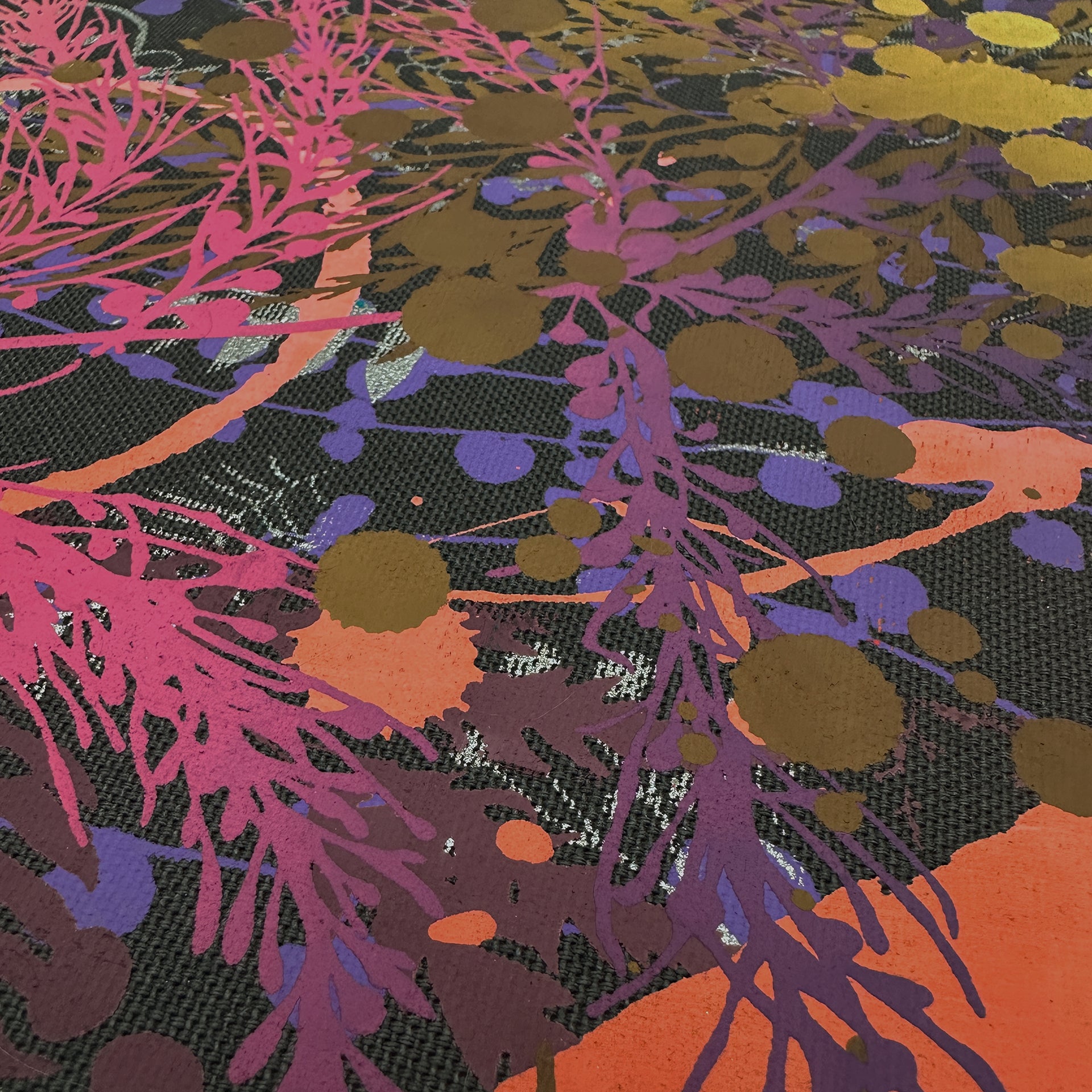 These unique and limited artworks have developed organically through hours of hand-printing in the studio. Whilst printing products pinned out onto our calico backing cloth, Clarissa noticed the beautiful serendipitous designs evolve from the random prints.
