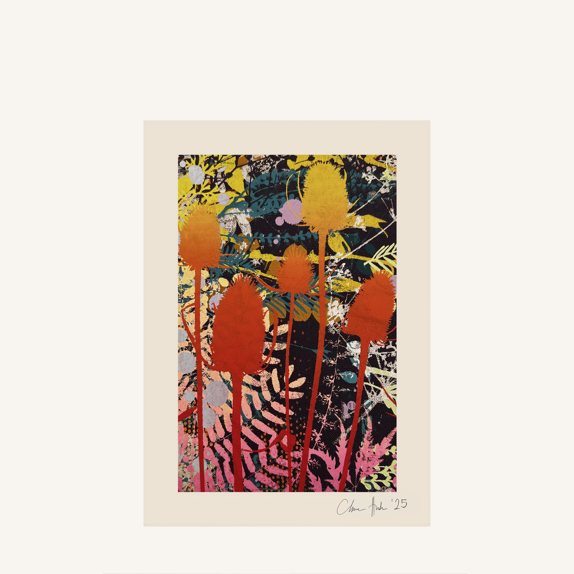 These one-off artworks have been individually cut from the cloth and mounted ready for framing. Every piece is different and has been personally selected and signed by Clarissa.