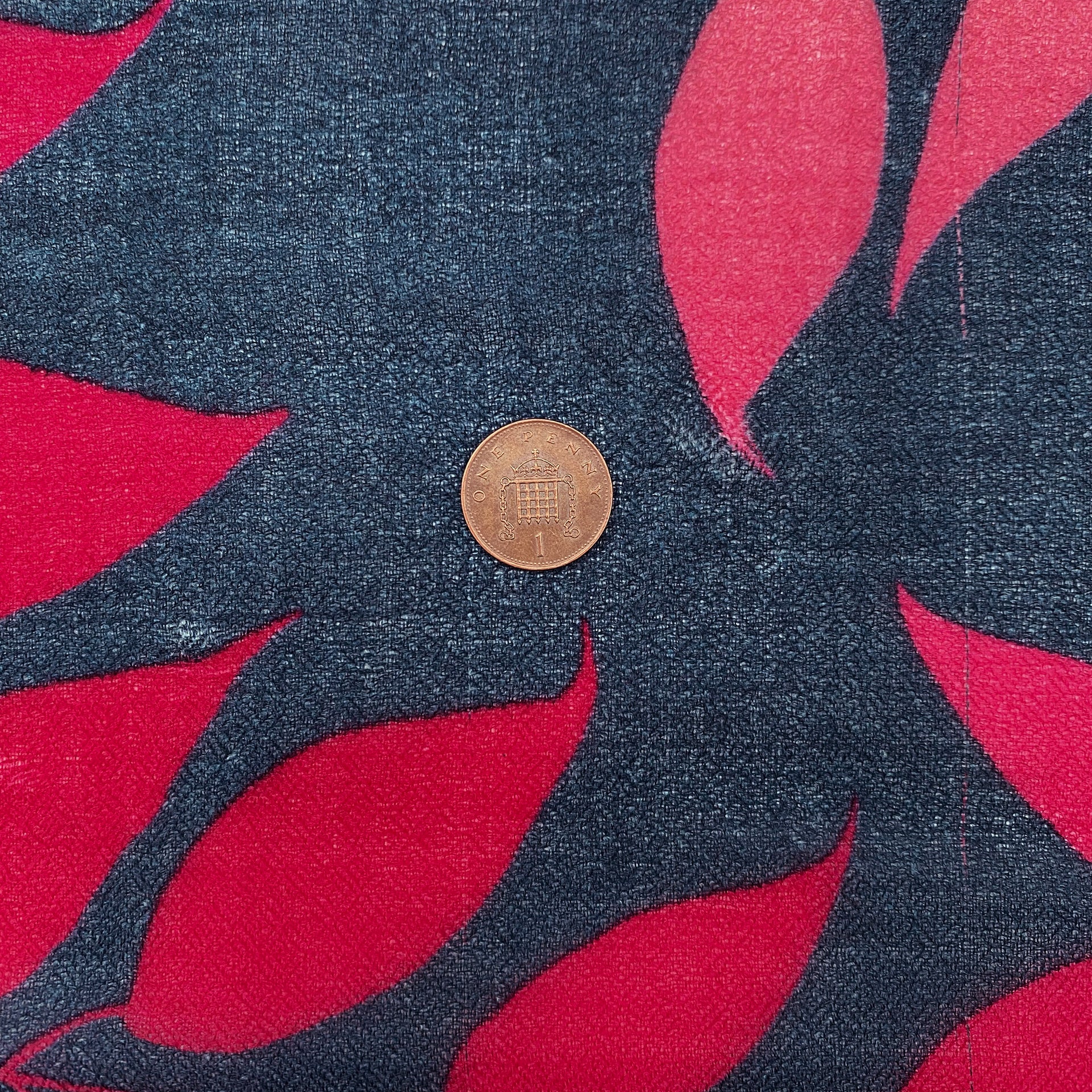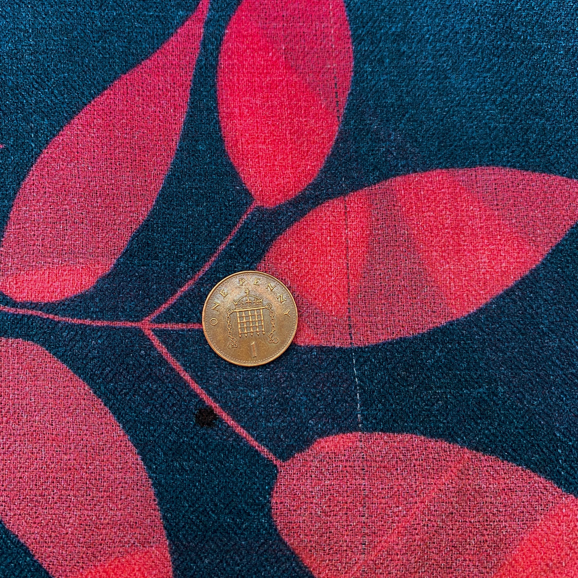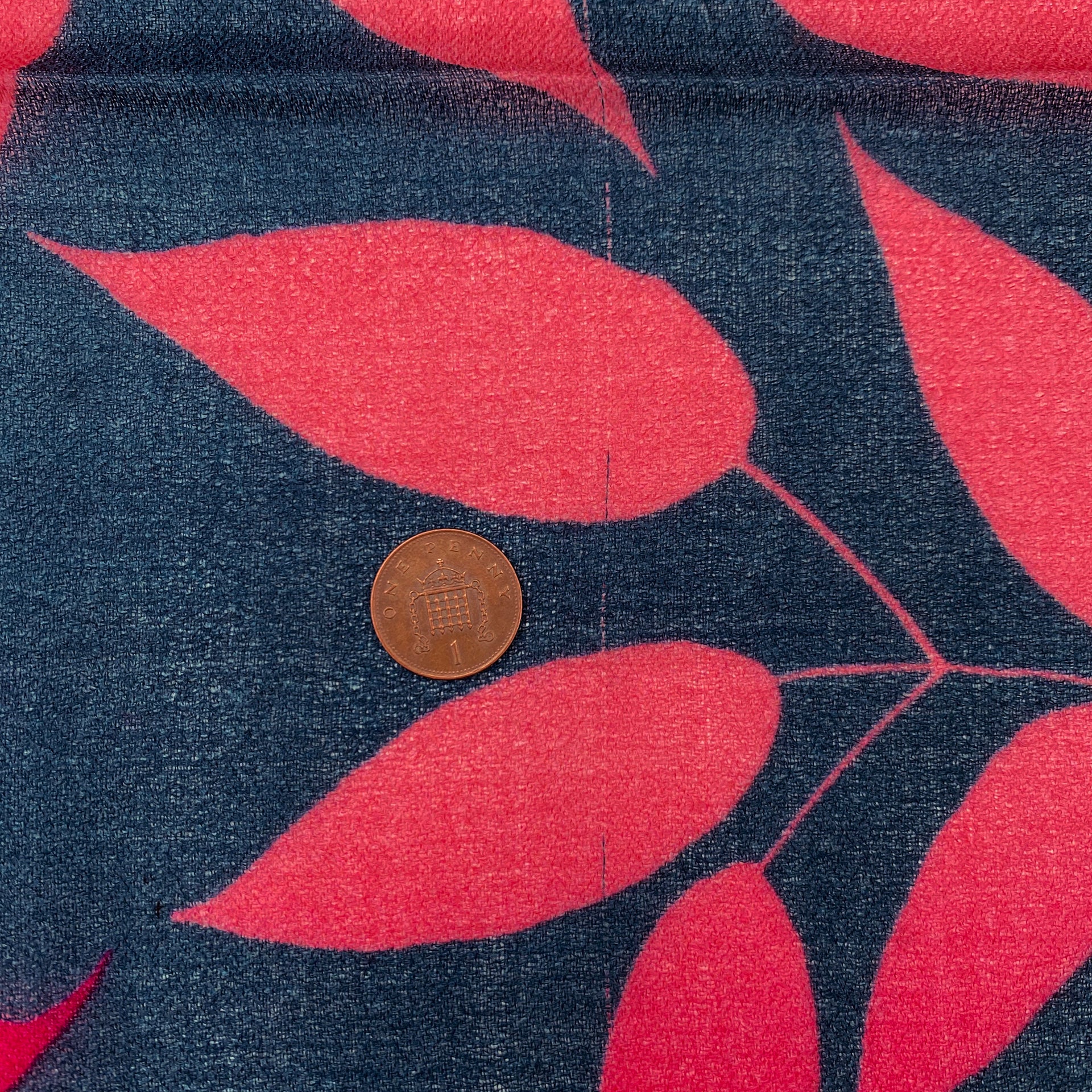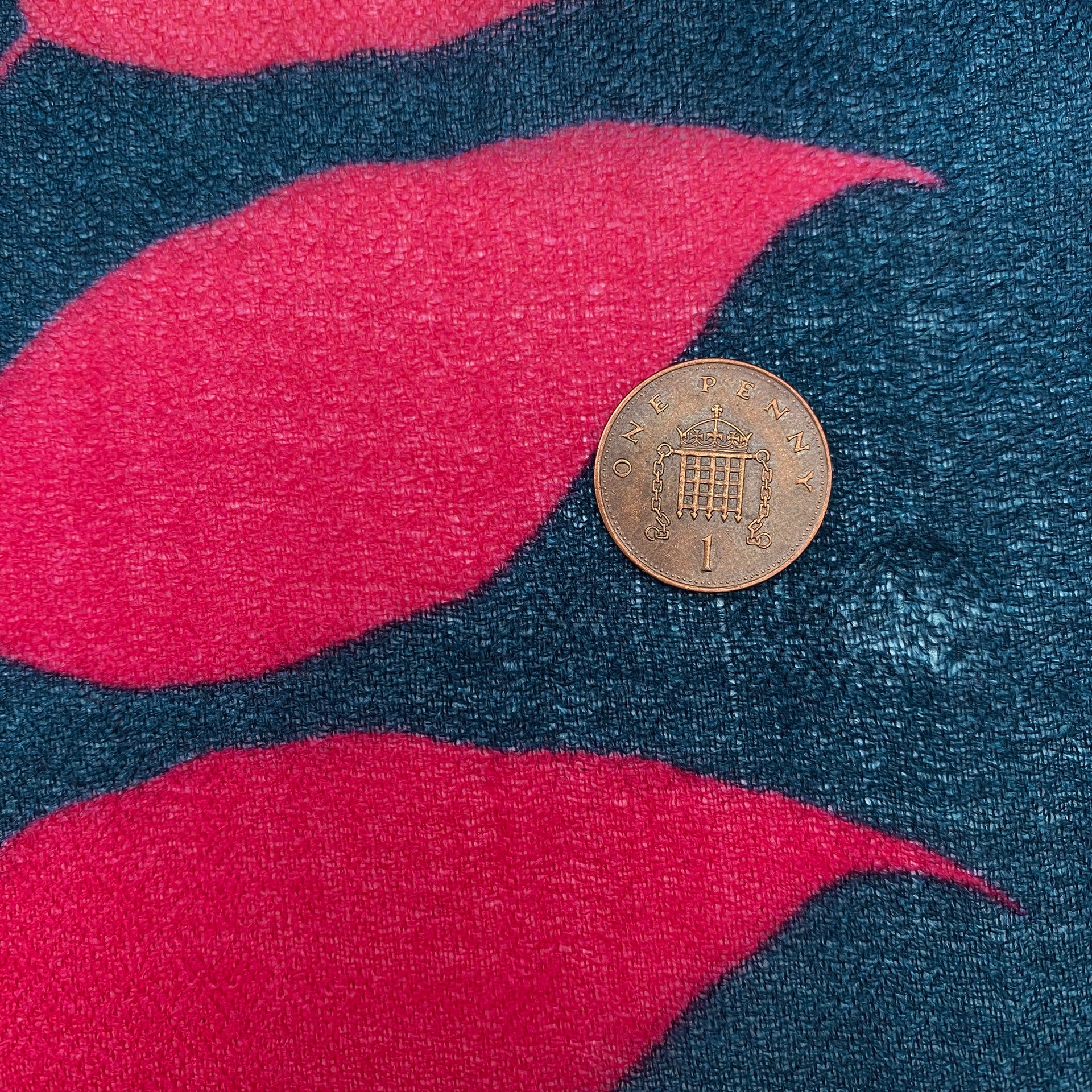 Inspired by a spray of ash leaves found in her local park, Highbury Fields, Clarissa played with the curves of the leaves to create this flowing graphic leaf design. Set against a navy blue background the pattern ombres from strawberry pink to a deep fuchsia, this versatile colour combination makes this scarf an easy piece to liven up an outfit.