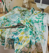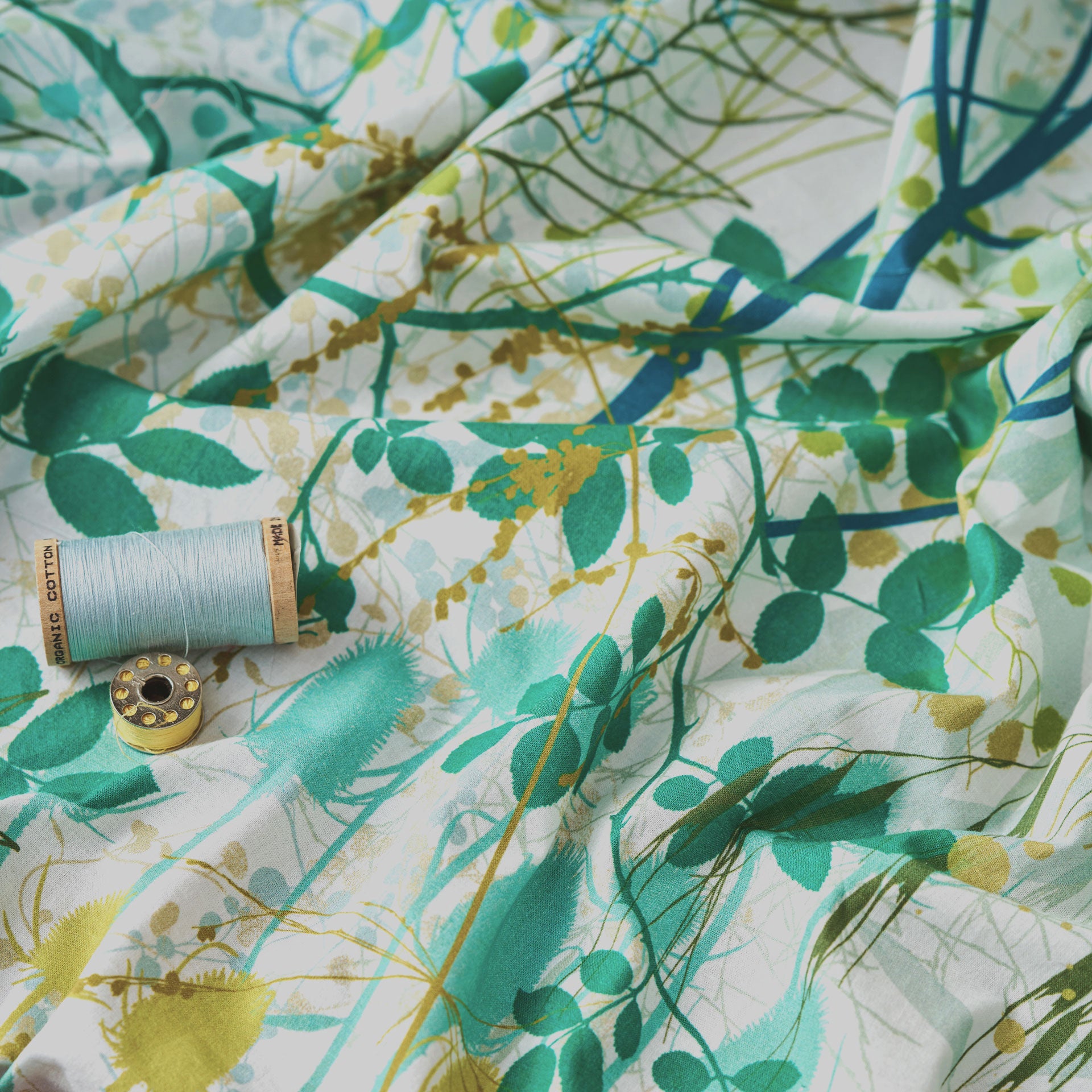 The Serendipity fabric is an invitation to enter an enchanted garden at golden hour. Delicate layers of foliage in rich, zesty tones from hot pink, to kingfisher blue with spots of orange, mustard and teal, draw the eye into this magical world. Every flower, leaf, stem and seedhead was collected by Clarissa on one of her nature wanders.