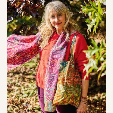 This fun and beautiful print was inspired by the studio backing cloth. Seedheads and leaves are layered together in a collision of autumnal hues including rust, teal, olive, and ochre.