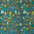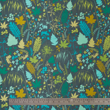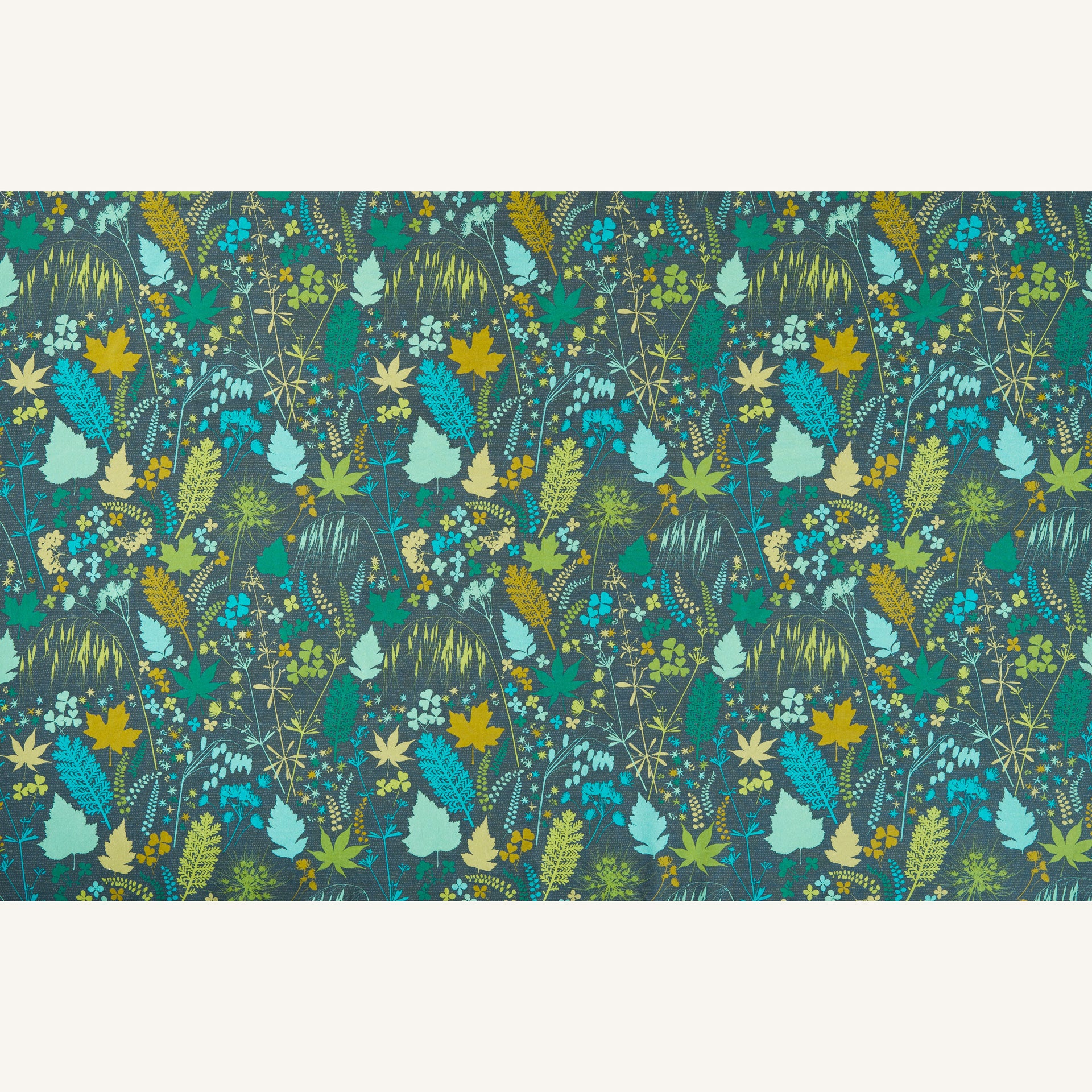 Scattered leaves, seed heads and grasses in racing green, lime, turmeric and chartreuse tessellate together across a charcoal dotted background.