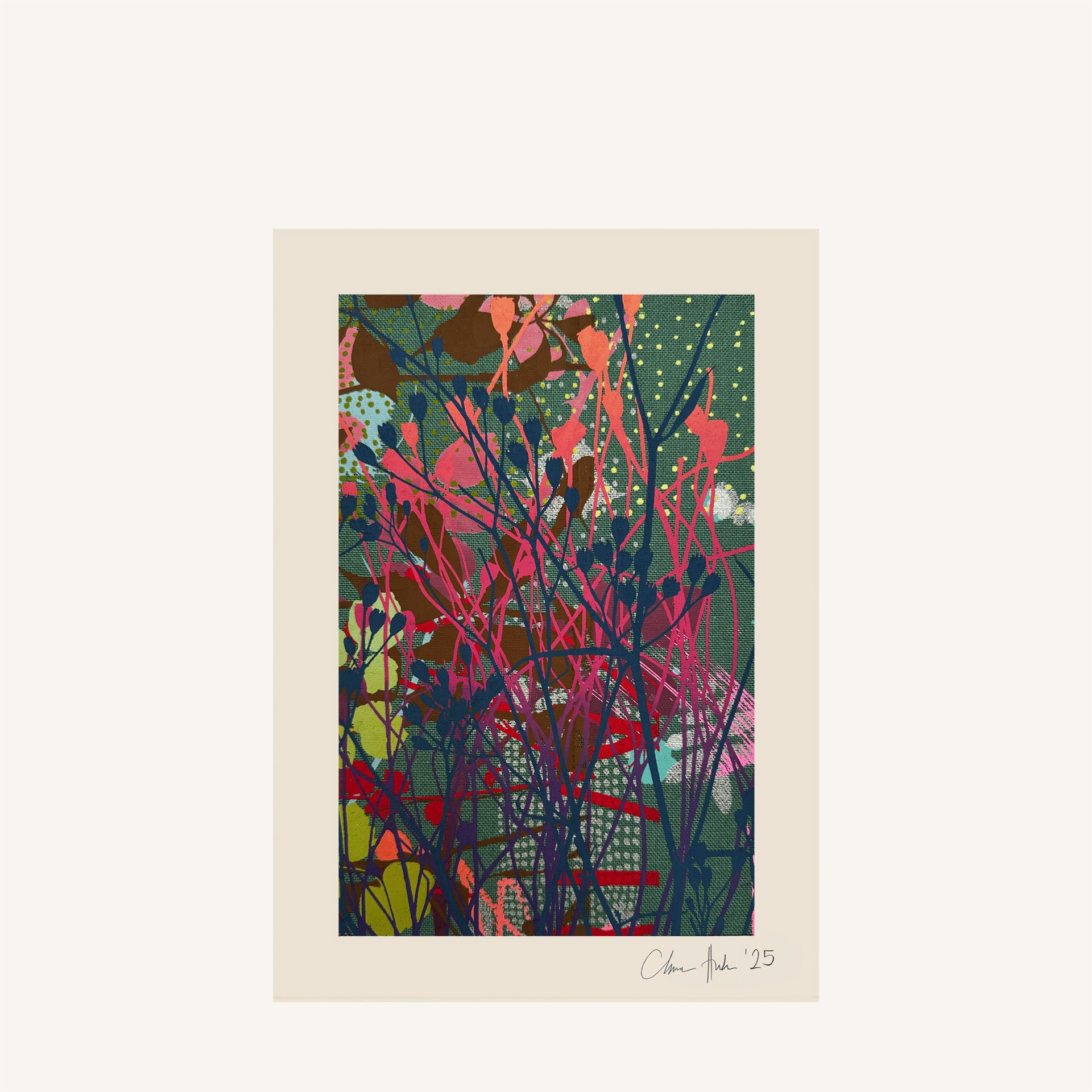 These one-off artworks have been individually cut from the cloth and mounted ready for framing. Every piece is different and has been personally selected and signed by Clarissa.