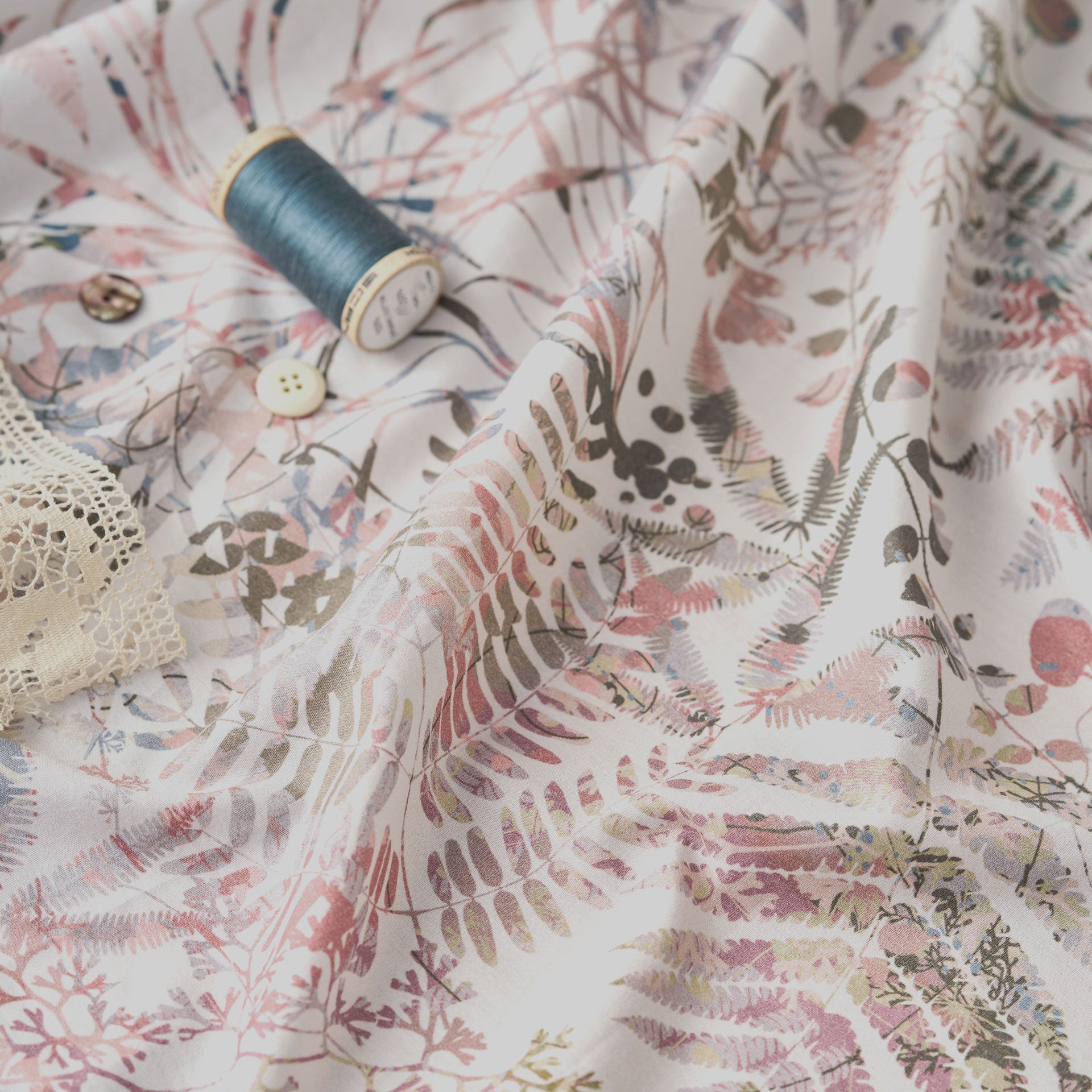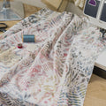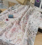 Enraptured by the biodiversity encountered on a visit to the cloud forests in Cost Rica, Clarissa photographed hundreds of species of ferns and epiphytes (plants which grow in trees) creating an extensive library of botanical images. Rose pink, sage and silver trailing plants and vines, wind their way across the ivory cotton, recreating the luscious jungle on the cloth.